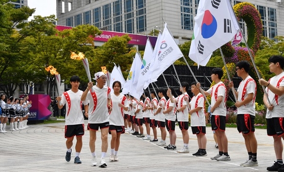 합화된 성화는 ‘글로벌 허브도시 부산에서 하나되는 대한민국’을 상징하는 불꽃으로, 이날 시청 앞을 출발해 연제구를 시작으로 4일간 16개 구·군을 순회한다. 1200여 명의 주자가 참여하는 이번 봉송은 부산 전역을 뜨겁게 달구며 시민들의 체전 성공 염원을 모을 예정이다.
