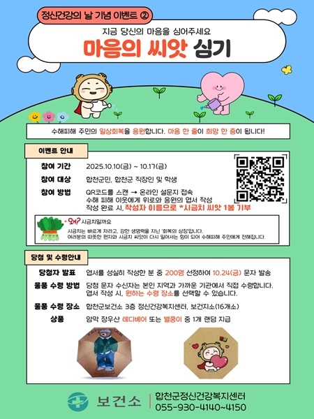 경남 합천군은 올해 정신건강 홍보주간(10월 10~24일)을 맞아 수해 피해 주민의 일상 회복을 응원하고 지역사회에 따뜻한 마음을 전하기 위한 '마음의 씨앗 심기' 캠페인을 운영하고 있다.