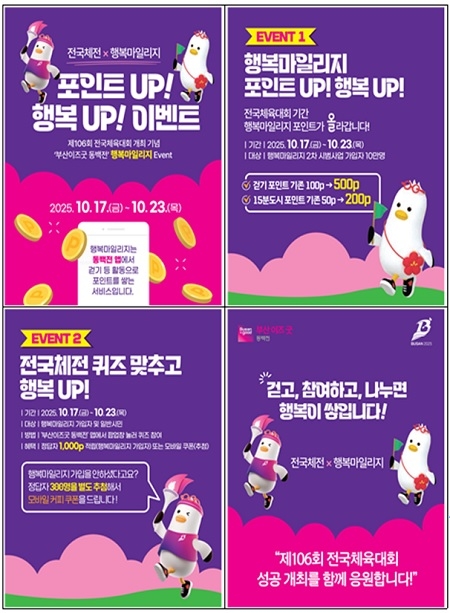 부산시가 제106회 전국체육대회 개최를 기념해 ‘부산이즈굿 동백전’의 행복마일리지 특별 이벤트 ‘포인트 업(UP)! 행복 업(UP)!’을 오는 17일부터 23일까지 7일간 진행한다고 14일 밝혔다.