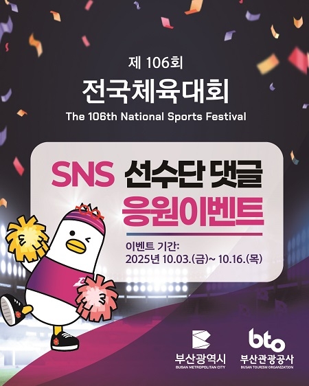 이외에도 공사 SNS채널인 비짓부산 인스타그램에서는 전국체전 응원 온라인 이벤트도 2회에 걸쳐 진행되며, 참여자 중 추첨을 통해 다양한 부산 기념품을 증정할 예정이다.
