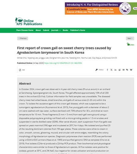이 결과 국내에서는 처음으로 체리에서 발생한 혹병(Agrobacterium larrymoorei)이 규명돼 국제 학술지(Plant Disease)에 보고됐다.