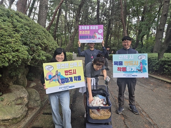 부산시설공단이 지난 15일 금강공원 정문 앞에서 반려인과 비반려인이 함께 참여하는 ‘펫티켓 캠페인’을 열고, 공원 내 안전하고 성숙한 반려문화 조성을 위한 홍보활동을 펼쳤다.