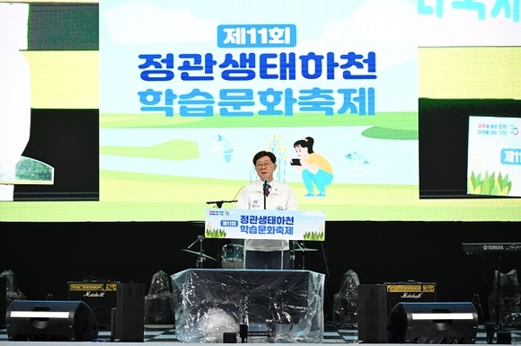 정종복 군수가 정관 생태하천 학습문화축제에서 인사말을 하고 있다.(사진=기장군 제공)