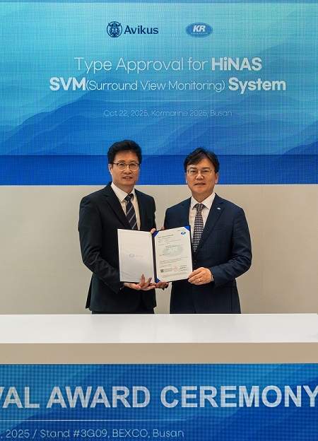 한국선급(KR)은 부산에서 열리고 있는 ‘코마린2025(KORMARINE 2025)’에서 HD현대그룹 자회사인 아비커스(Avikus)가 개발한 항해보조시스템 하이나스 SVM(HiNAS SVM)에 대해 세계 최초로 형식승인을 수여했다고 22일 밝혔다.