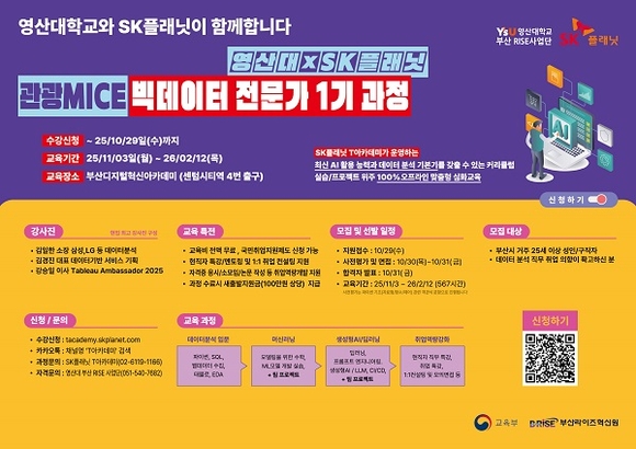 이번 과정은 영산대 부산RISE사업단과 SK플래닛이 협력해 부산지역의 디지털 전환과 인재 양성을 목표로 개설한 실무 중심 빅데이터 전문가 양성 교육이다. 특히 지역 전략 산업인 관광·MICE 분야와 빅데이터 분석 기술을 융합한 전문 인력을 육성하는 데 중점을 둔다.