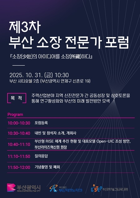부산테크노파크(부산TP)가 부산시, 부산과학기술고등교육진흥원(BISTEP)과 함께 오는 31일 부산시티호텔에서 ‘제3차 부산 소장 전문가 포럼'을 개최한다.