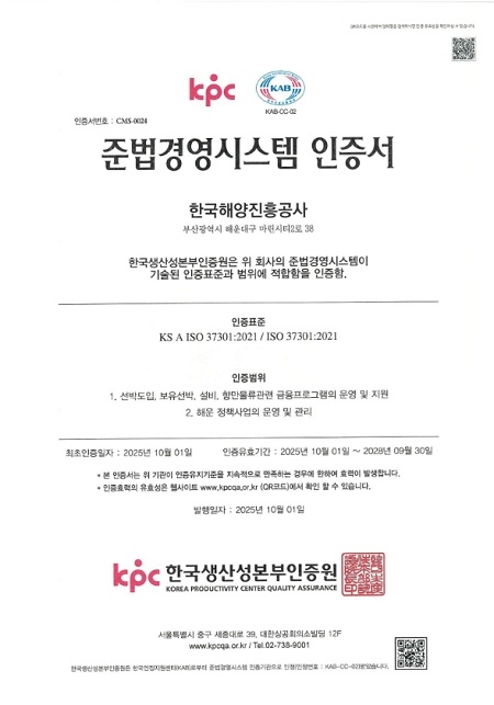 한국해양진흥공사가 올해 10월부터 투명하고 책임 있는 경영체계 강화를 위해 국제표준인 부패방지경영시스템(ISO37001) 2년차 인증과 더불어 새롭게 준법경영시스템(ISO37301) 인증을 취득했다고 밝혔다.