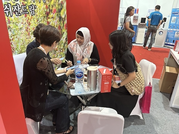 참가 교육생은 우리나라 기업 410개 사와 1천여 개의 바이어사가 참가한 ‘2025 자카르타 국제프리미엄 소비재전’에서 현지 바이어를 상대로 상담 가이드 활동에 나섰다.
