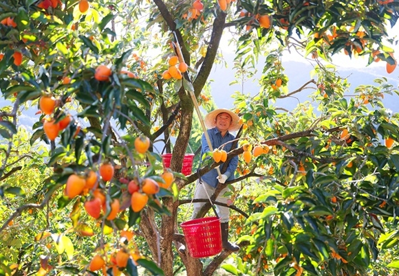 29일 곶감 주산지인 경남 함양군 서하면 오현마을 신서성 씨가 곶감용 재료인 고종시 감을 따고 있다.