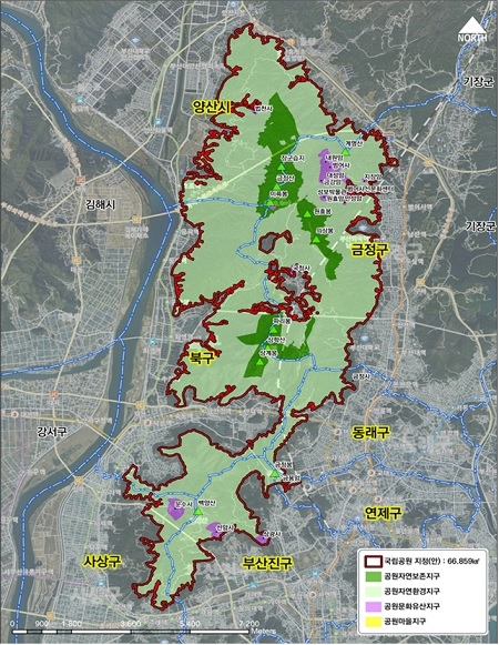 금정산국립공원의 총 면적은 66.859㎢로, 이 중 약 78%(52.136㎢)가 부산 6개 자치구에, 나머지 22%(14.723㎢)는 경남 양산시에 걸쳐 있다. 금정산뿐 아니라 낙동정맥으로 이어지는 백양산 일대도 공원 구역에 포함됐다. 이번 지정은 1987년 소백산 이후 37년 만에 비보호지역이 신규 국립공원으로 지정된 사례로, 국립공원 제도 역사에서도 의미 있는 전환점으로 평가된다.