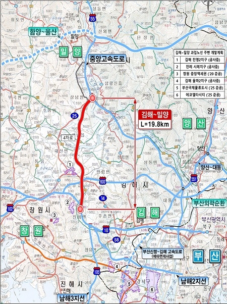 김해~밀양 고속도로 건설사업은 사업비 1조 4965억 원, 총연장 19.8km 규모로 김해시 진례면과 밀양시 상남면을 연결하는 노선이다. 이 노선은 남해고속도로, 중앙고속도로, 중부내륙고속도로를 연계하는 핵심 구간으로 완공 시 부산·경남 내륙권 간 통행시간이 획기적으로 단축되고 물류 흐름의 효율성이 대폭 향상될 것으로 기대된다.