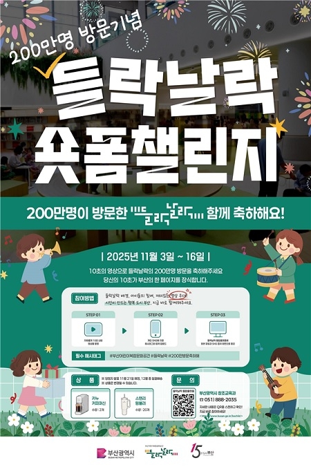 부산시가 들락날락의 2025년 누적 방문자 200만 명 달성을 기념해 3일부터 오는 16일까지 2주간 시민과 함께하는 '들락날락 숏폼 챌린지'를 진행한다고 밝혔다.