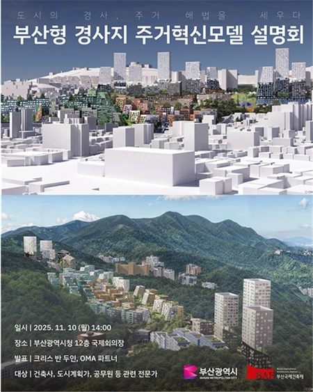 부산시는 10일 시청 국제회의장에서 네덜란드 건축그룹 오엠에이(OMA)와 함께 ‘도시의 경사, 주거 해법을 세우다 - 부산형 경사지 주거혁신모델 설명회’를 개최한다. 이번 설명회는 ‘경사지 등 재개발사업 부산형 주거모델 개발 시범사업’의 일환으로, 부산의 지형적 특성을 반영한 새로운 주거 해법을 모색하기 위해 마련됐다.