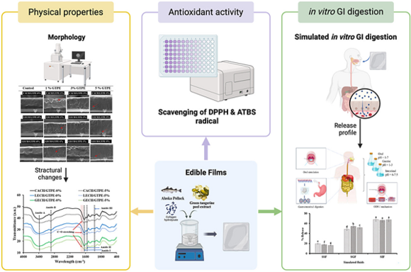 명태 껍질(Alaska pollock skin)에서 얻은 콜라겐 가수분해물에 청귤 껍질 추출물(green tangerine peel extract)을 혼합해 식용필름을 제조한 결과, 필름의 기계적 안정성, 산소 차단성, 열적 안정성이 향상됐고, 항산화 활성과 위장관 내 점진적 방출 특성(gastrointestinal release)도 크게 개선된 것으로 확인됐다. 연구진은 “이러한 특성이 단순한 보호 필름을 넘어, 섭취 가능한 기능성 포장재 및 지속 방출형 건강소재로 활용될 수 있음을 보여준 중요한 성과”라고 설명했다.