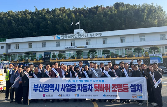 한국교통안전공단 부산본부와 ㈜에스라이팅은 부산시, 부산경찰청, 사업용 운수단체 등 교통 유관기관과 함께 지난 13일 사업용 차량 뒷바퀴 조명등 400대를 기탁하고 장착 시연했다고 14일 밝혔다.