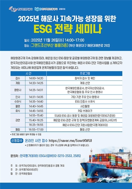한국해양진흥공사가 한국자산관리공사(캠코)와 함께 오는 26일 부산 그랜드조선 호텔에서 '해운사 지속가능 성장을 위한 ESG 전략 세미나'를 개최한다고 밝혔다. 이번 세미나는 해운업계의 ESG 경영 기반을 강화하고 국제 규제 변화에 대응하기 위한 민·관 협력의 일환으로 마련됐다.