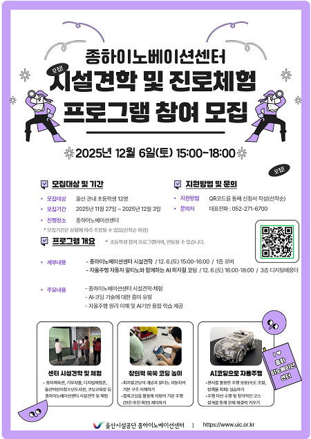 프로그램 대상은 관내 초등학생 12명이며, 참여 신청은 27일부터 내달 3일까지 종하이노베이션센터 홈페이지 내 QR코드를 통한 온라인 접수로 진행된다.