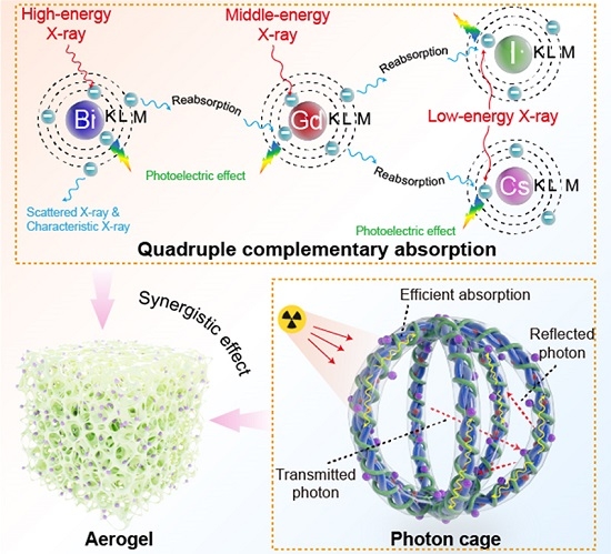 연구팀은 가돌리늄(Gd) 기반 상분리 유도 전략을 적용해 3차원 ‘광자 케이지’ 구조를 갖는 유연성 에어로겔을 개발하는 데 성공했다. 연구팀은 여기에 폴리다이메틸실록산(PDMS) 코팅을 추가하고, 페로브스카이트 물질인 Cs3Bi2I9까지 결합해 초탄성·소수성·단열성·내동결성의 우수한 물성과 함께 4중 상호보완 X선 흡수 특성을 갖춘 차세대 X선 차폐 소재를 구현했다.