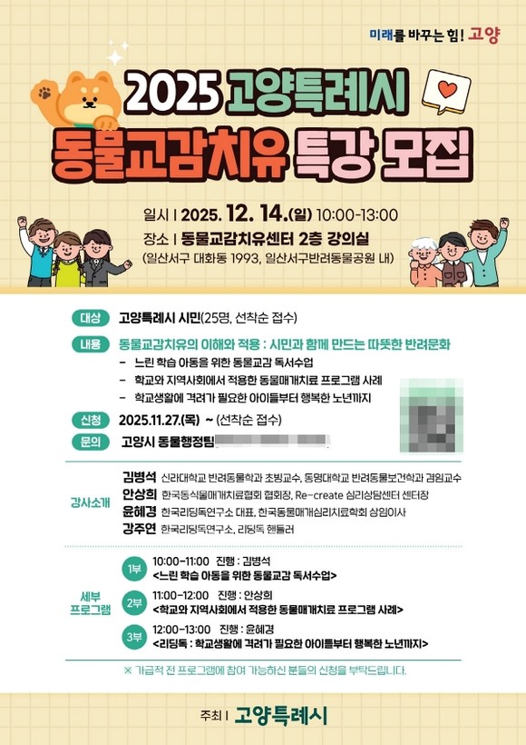고양시는 동물교감치유에 대한 시민 이해도를 높이기 위한 ‘2025년 동물교감치유 특강’ 수강생을 모집한다고 밝혔다. 특강은 오는 14일 일산서구 동물교감치유센터에서 열린다.