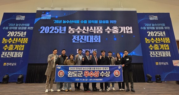 완도군은 지난달 28일 전남 무안군에서 열린 「2025년 전남 농수산식품 수출 우수 시군 평가」에서 22개 시군 중 우수상을 수상했다.