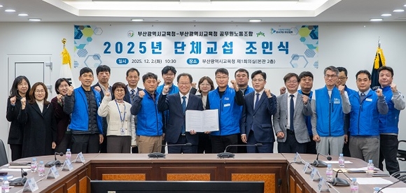 부산시교육청과 시교육청공무원노동조합은 2일 교육청 회의실에서 단체협약을 체결하며 지방공무원의 근로조건 개선과 학교 행정업무 경감을 위한 협력 관계를 공식화했다. 협약식에는 김석준 교육감을 비롯한 교육청 간부와 노동조합 송언용 위원장 등 20여 명이 참석했다.