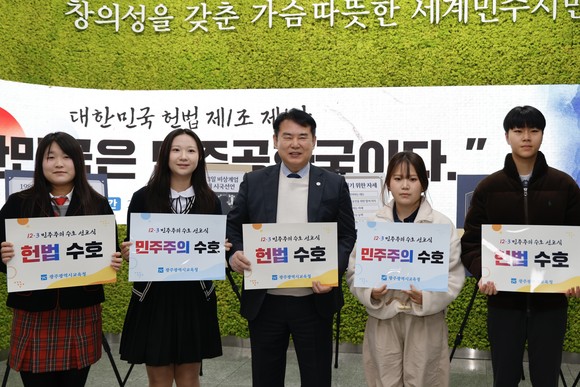 광주시교육청(교육감 이정선)은 3일 본청 북카페에서 교직원, 학생의회 소속 학생들이 참여한 가운데 ‘12·3 민주주의 수호 선포식’을 개최했다.