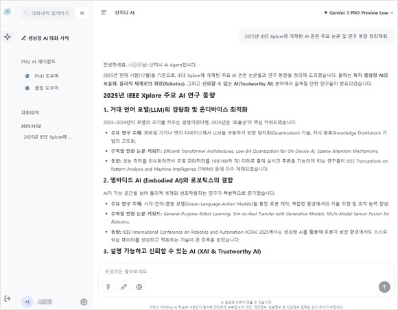 부산대는 ‘부산대(PNU) AX 대전환 프로젝트’의 일환으로 대학 자체 기술력을 기반으로 구축한 AI 에이전트 서비스 '산지니 AI'를 지난 2일 시범 오픈하고, 대학 차원의 AI 기반 교육정보서비스 제공에 나선다고 4일 밝혔다.