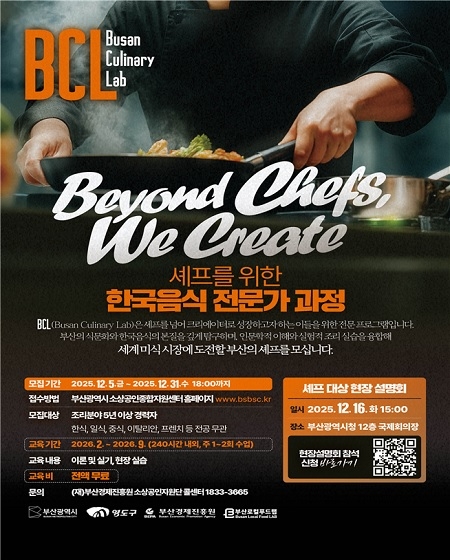 부산경제진흥원이 부산 미식 산업을 이끌 전문 인력 발굴을 목표로 ‘BCL(Busan Culinary Lab) 한식 전문가 과정’ 교육생을 오는 5일부터 31일까지 공개 모집한다고 4일 밝혔다. 부산을 대표할 차세대 스타 셰프와 창의적 한식 전문가를 육성하겠다는 취지다.