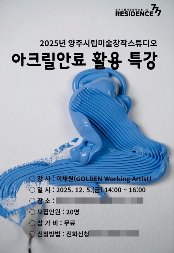 양주시립미술관은 5일 오후 2시부터 4시까지 양주시립미술창작스튜디오에서 지역 예술인의 창작 역량 강화를 위한 ‘아크릴 안료 활용 특강’을 진행했다. 이번 교육은 입주작가뿐 아니라 역대 입주작가와 지역 예술인에게도 개방됐다.
