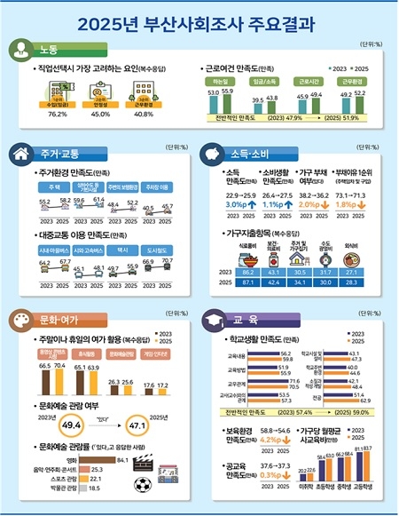 부산시가 5일 발표한 '2025 부산사회조사' 결과에 따르면 시민들의 생활 전반에서 만족도가 지난해보다 개선된 것으로 나타났다. 1996년 첫 조사를 시작으로 올해 30회를 맞이한 부산사회조사는 시민 의식과 생활 수준, 사회 변화를 체계적으로 분석해 지역 정책의 기초 자료로 활용되는 장기 조사다. 올해 조사는 지난 8월 19일부터 9월 8일까지 21일 동안 표본가구 1만7860곳의 15세 이상 시민 3만1744명을 대상으로 노동, 주거·교통, 문화·여가, 교육, 소득·소비 등 5개 분야, 총 55개 항목에 대해 진행됐다.