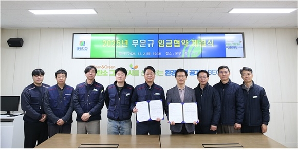 부산환경공단이 어려운 경영 여건 속에서도 25년 연속 무분규 임금협약을 체결하며 안정적인 노사관계를 다시 한번 입증했다. 공단은 지난 2일 이근희 이사장과 강선춘 노조위원장 등 노사 대표가 참석한 가운데 2025년도 임금협약 체결식을 진행했다.