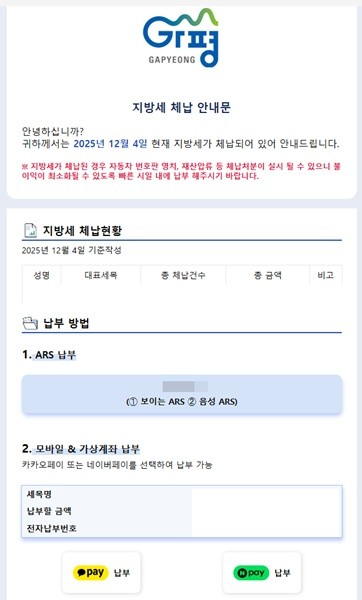 가평군이 지방세 체납액 징수 강화를 위해 최근 체납자 4,790명에게 총 44억 원 규모의 지방세 체납안내문을 카카오톡 모바일 전자고지로 일제히 발송했다.