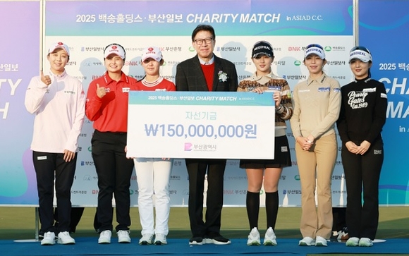 부산시는 지난 7일 아시아드컨트리클럽에서 열린 ‘백송홀딩스·부산일보 채리티 매치(CHARITY MATCH in ASIAD C.C.)’에서 참가 선수들이 부산 체육 발전을 위해 총 1억5천만 원을 기부했다고 밝혔다. 전달식에는 박형준 시장을 비롯해 손영신 부산일보 사장, 박정삼 백송홀딩스 회장, 김도형 아시아드컨트리클럽 대표이사 등이 함께했다.