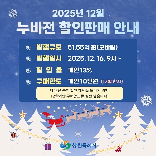 경남 창원시는 연말 가계부담 완화와 지역경제 활성화를 위해 오는 16일 오전 9시부터 '모바일 누비전' 51억여 원을 추가 발행한다고 8일 밝혔다.