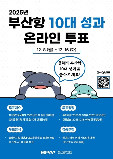 부산항만공사(BPA)는 9일, 2025년 한 해 동안 부산항이 이룬 주요 성과 가운데 국민 눈높이에 맞는 우수 사례를 직접 뽑는 ‘2025년 부산항 10대 성과’ 온라인 투표를 추진한다고 밝혔다. BPA는 이번 투표를 통해 공기업의 성과를 국민과 공유하고, 공감할 수 있는 대표적 성과를 도출하겠다는 방침이다.