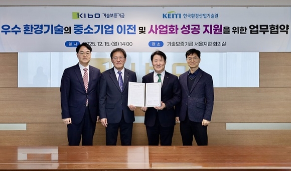 기술보증기금은 지난 15일 기보 서울지점에서 한국환경산업기술원(KEITI)과 '우수 환경기술의 중소기업 이전 및 사업화 성공 지원을 위한 업무협약'을 체결했다고 밝혔다.