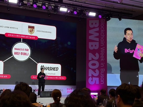 22일 시그니엘 부산에서 개최된 블록체인 위크 인 부산 2025 (BWB2025) 콘퍼런스에서 김상민 부산디지털자산거래소 대표가 웹3 디지털지갑 '비단주머니'를 소개하고 있다.(사진=임재희 기자)