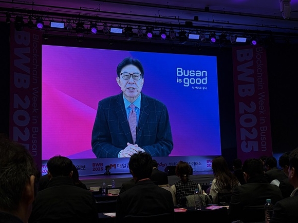 블록체인 위크 인 부산 2025 (BWB2025) 콘퍼런스에서 박형준 부산시장의 영상 축사.(사진=임재희 기자)