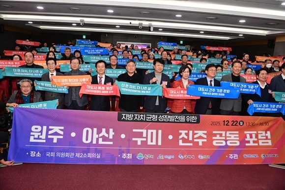 이번 포럼은 진주시를 비롯해 원주·아산·구미시가 공동 주최하고, 국회에서는 ▲진주의 박대출·강민국 의원 ▲원주의 박정하·송기헌 의원 ▲아산의 복기왕 의원 ▲구미의 구자근·강명구 의원이 함께 참여해 대도시 특례 확보를 통한 지역 균형발전 방안을 모색하기 위해 마련됐다.