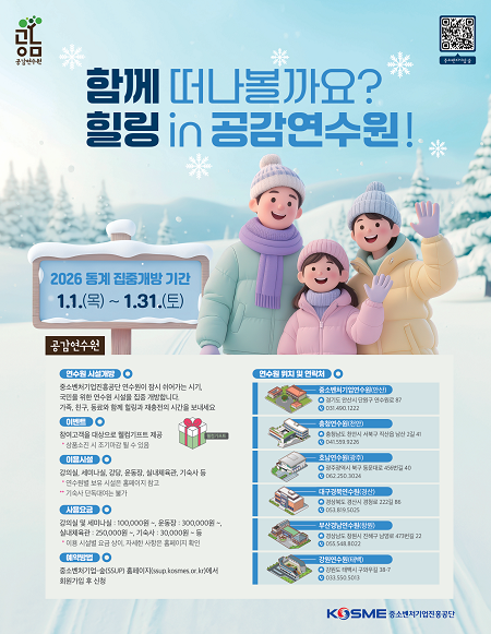 조한교 중진공 인력성장이사는 “새해를 맞아 지역사회와 함께 연수원의 문을 여는 ‘공감연수원’이 더 많은 국민에게 의미 있게 다가가길 바란다”며 “앞으로도 지역과 상생하는 열린 연수원의 역할을 다하겠다”고 강조했다.