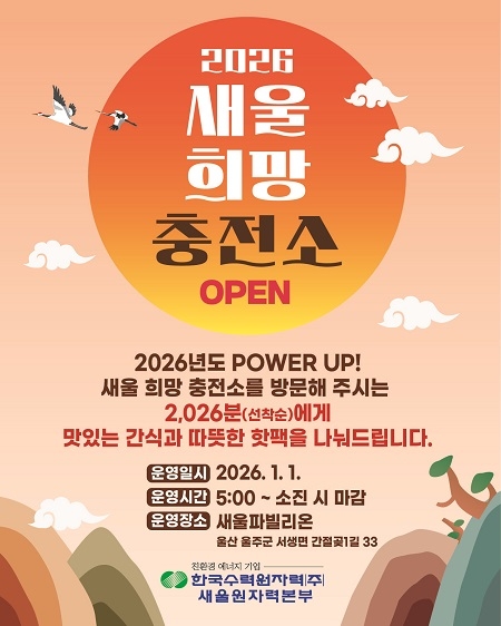 한국수력원자력(주) 새울원자력본부는 내년 1월 1일 대한민국 대표 해맞이 명소인 간절곶에 위치한 새울 파빌리온에서 ‘2026 해맞이 새울 희망 충전소’를 운영한다고 30일 밝혔다.