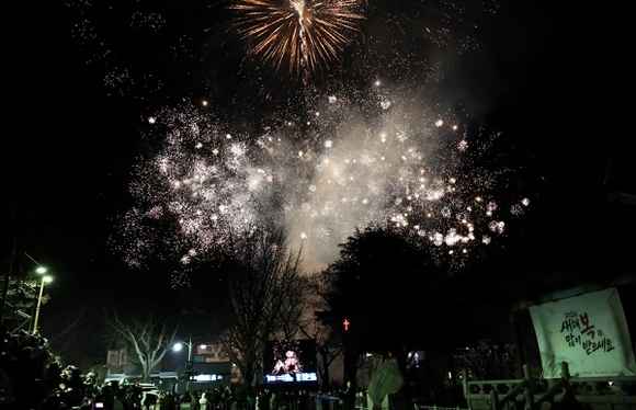 2026년 새해를 맞아 용두산공원에서 열린 부산 시민의 종 타종행사에서 박형준 시장과 시민대표들이 힘차게 종을 울리고 있다.(사진=부산시 제공)