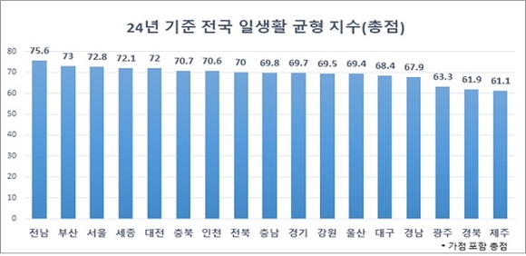 부산의 2024년 기준 일·생활 균형 점수는 73점으로, 전남(75.6점)에 이어 두 번째로 높았다. 서울(72.8점)이 그 뒤를 이었다. 부산은 2017년 기준 39.5점에서 출발해 꾸준한 상승세를 이어왔으며, 올해는 전년보다 7.7점 오른 65.3점에서 73점을 기록해 역대 최대 상승폭을 보였다.