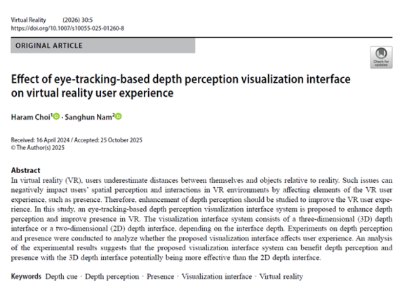 국립창원대학교 메타융합콘텐츠학부 디지털 휴먼 연구실(지도교수 남상훈)은 시선추적(eye-tracking) 정보를 활용해 가상현실(VR) 환경에서 사용자의 깊이(거리) 인지를 개선하는 시각화 인터페이스를 제안해 가상현실 분야 최고 권위지인 Virtual Reality(IF=5.0, JCR Computer Science, Software Engineering 분야 상위 11.2%[15/129])에 게재했다고 9일 밝혔다.