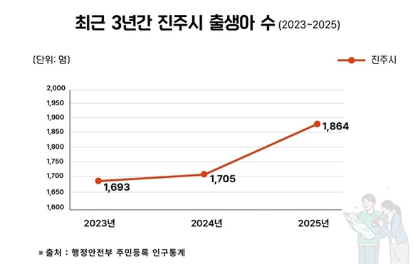 지난 5일 행정안전부의 주민등록 인구통계 발표에 따르면 진주시의 주민등록 출생아 수는 2023년 1693명으로 저점을 찍은 후, 2024년 1705명, 2025년 1864명으로 뚜렷한 증가세를 보였다.