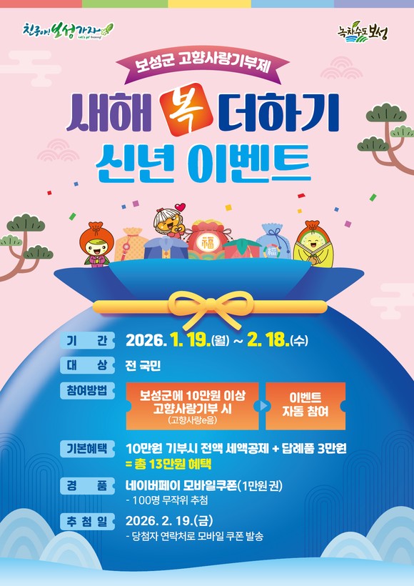 보성군은 2026년 새해를 맞아 고향사랑기부제 참여를 확대하고 기부 문화를 활성화하기 위해 오는 2월 18일까지 ‘새해 복 더하기 신년 이벤트’를 추진한다고 밝혔다.