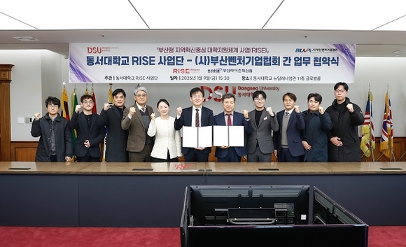 동서대학교와 (사)부산벤처기업협회는 최근 뉴밀레니엄관 11층 글로벌룸에서 부산 지역 전략산업 발전과 지역혁신중심 대학지원체계(RISE) 사업의 성공적 추진을 위한 업무협약(MOU)을 체결했다고 23일 밝혔다.