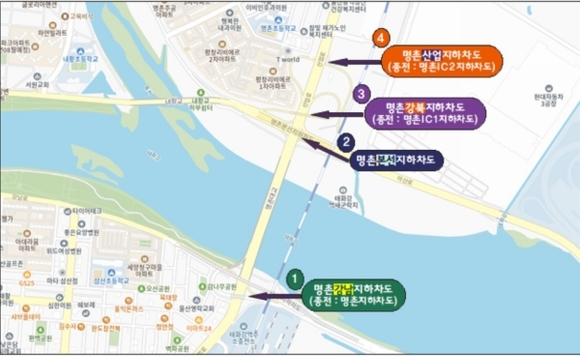 이에 따라 ‘명촌지하차도, 명촌IC 1지하차도, 명촌IC 2지하차도’를 각각 ‘명촌강남지하차도, 명촌강북지하차도, 명촌산업지하차도’로 변경하고, ‘명촌본선지하차도’는 원래 명칭을 그대로 사용한다.