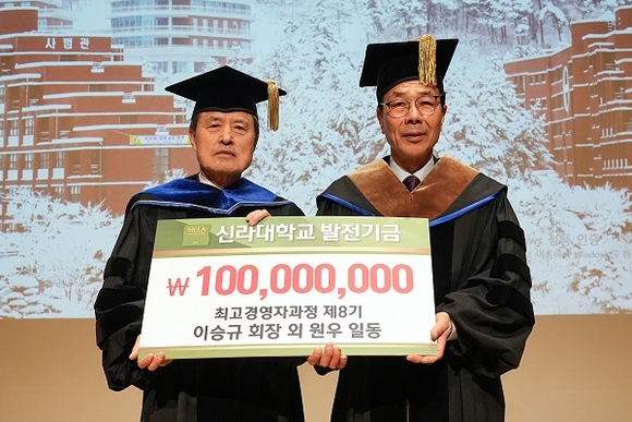 특히 이날 수료식에서는 최고경영자과정 제8기 원우회가 신라대 발전을 위해 1억 원의 대학 발전기금을 기탁하며 큰 박수를 받았다. 이번 기탁은 교육과정을 통해 형성된 동문 간 신뢰와 연대가 모교 발전으로 이어진 모범적인 사례로 평가받고 있다.