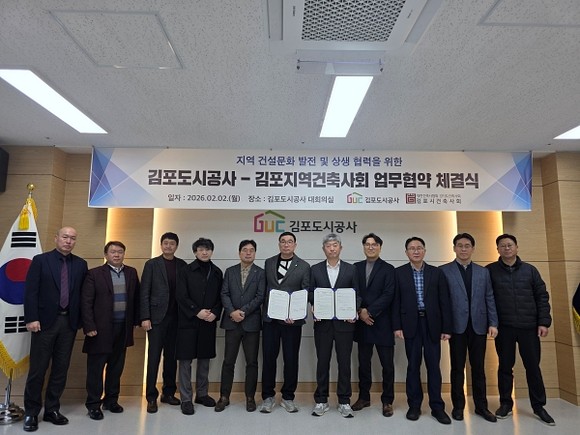 김포도시공사는 2일, 공사 대회의실에서 김포지역건축사회와 ‘지역 건설문화 발전 및 상생 협력을 위한 업무협약(MOU)’을 체결했다고 밝혔다.